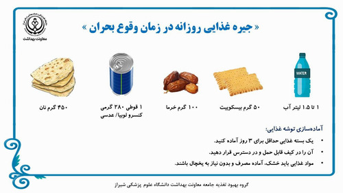 نیاز روزانه هر فرد به آب، بسته به شرایط محیطی و میزان فعالیت، افزایش مییابد.ذخیرهسازی کافی آب آشامیدنی سالم (حداقل ۴ لیتر به ازای هر نفر در روز برای شرب و بهداشت) و آموزش روشهای تصفیه آب در صورت لزوم، ضروری است.3. تمرکز بر مواد مغذی کلیدی: کربوهیدراتهای پیچیده: منبع اصلی انرژی، مانند بیسکوییت سبوسدار، میوههای خشک و غلات آماده. پروتئینها: برای حفظ توده عضلانی و ترمیم بافتها، مانند کنسرو ماهی تن، حبوبات، آجیل چربیهای سالم: تأمین کننده انرژی متراکم، مانند مغزها، دانهها . ویتامینها و مواد معدنی: مصرف کنسرو میوهها و سبزیجات (کم سدیم) برای تأمین ویتامینها و مواد معدنی ضروری است.مصرف ماهیانه یک عدد مکمل ویتامین دی پنجاه هزار واحدی جهت تقویت سیستم ایمنی به کارمندان و گروههای سنی بالای ۱۲سال توصیه می شود