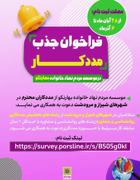 مؤسسه مردمنهاد خانواده بهارنکو استان فارس با هدف ارتقای خدمات حمایتی و اجتماعی، از مددکاران اجتماعی واجد شرایط در شهرهای شیراز و مرودشت دعوت به همکاری میکند.